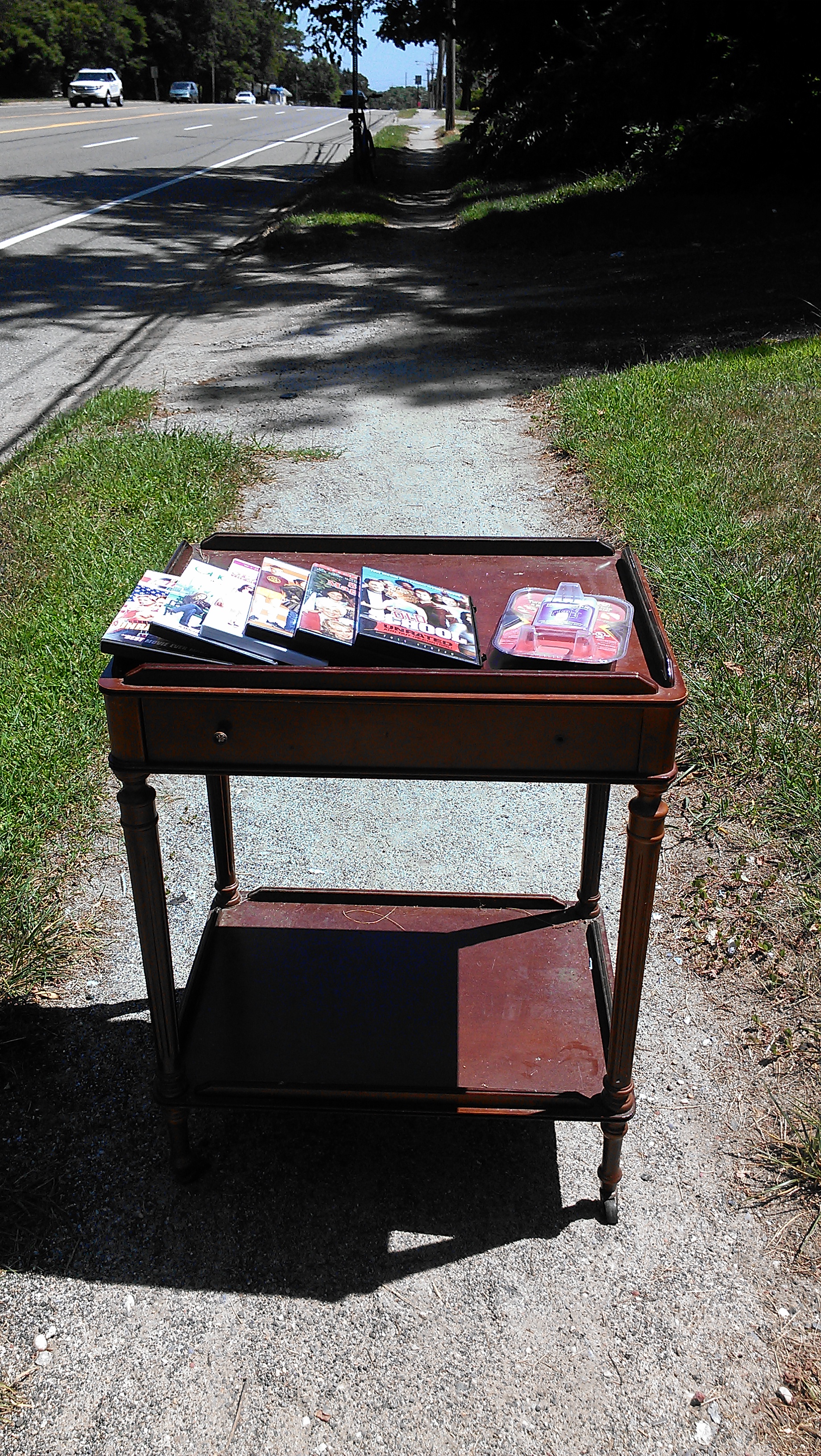 My finds: A handful of DVD’s, a plug-in insect repeller & a side table I plan on using as a nightstand.