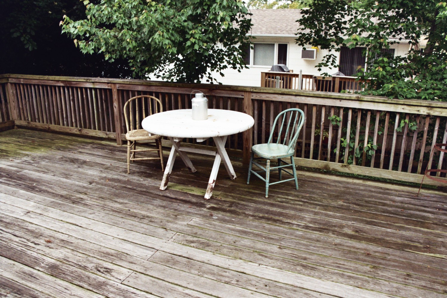 Off the sliding glass doors in the kitchen was the deck. I found the table on the side of the road and repainted it. The chairs were from two different estate sales. I love that they were mismatched. 🙂