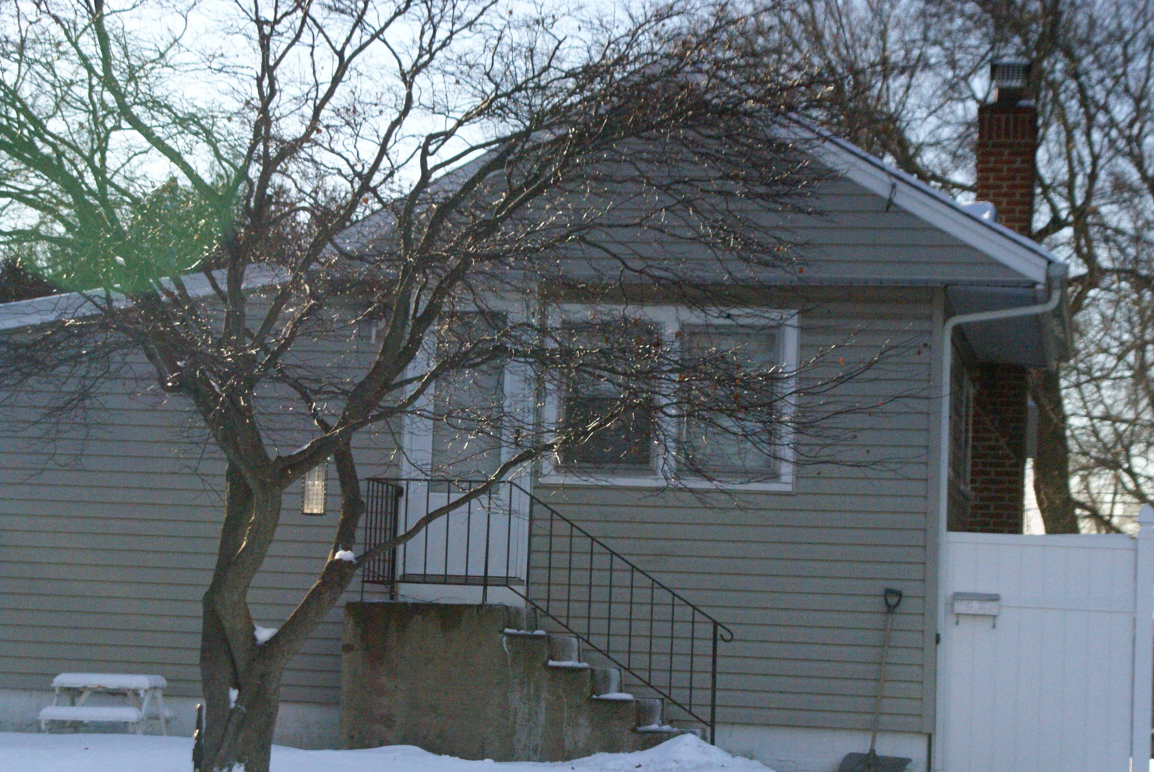 Keep in mind that my house was on the market when these pictures were taken, so although it was not cluttered by any means, I did pare it down to give it a more contemporary look. That also included replacing the antique sinks I had installed in the kitchen & the bathroom…..sigh :(. Here is the front of my little 811 square foot two bedroom cottage (one from summer, one from winter).