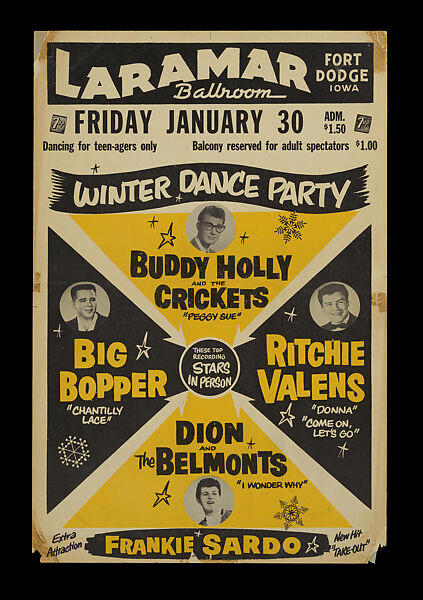 This poster from the 1959 tour advertises the three performers appearances in Fort Dodge, Iowa four days before they died in a plane crash near Clear Lake, Iowa. This is the only surviving poster from the show. It was previously on display at The Met in NYC.
