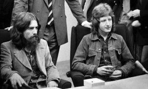 Top: Badfinger circa 1969 (L-R): Pete Ham, Joey Molland, Mike Gibbins and Tom Evans. Bottom: George Harrison (L) and Ham (R) in the studio in 1971. (Images found online. Original sources unknown.)