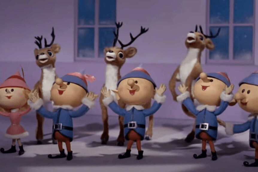 A group of elves and a few reindeer celebrating in song from the TV special. (Image found online.  Original source unknown.)
