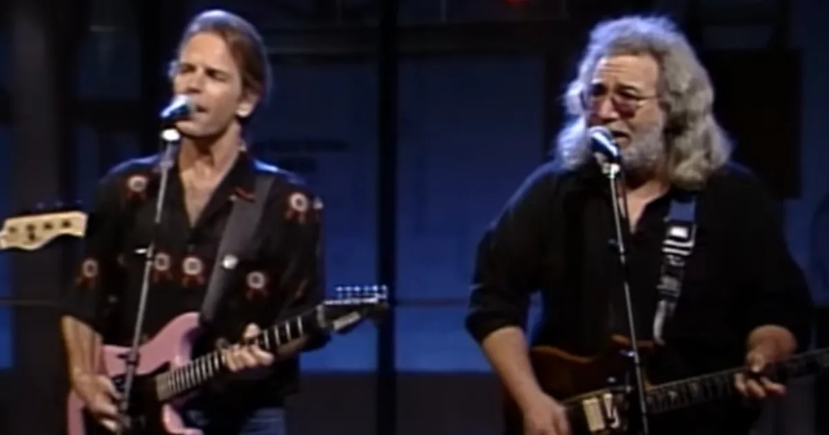 Jerry Garcia (L) and Bob Weir (R) on “Late Night with David Letterman” in September 1987.