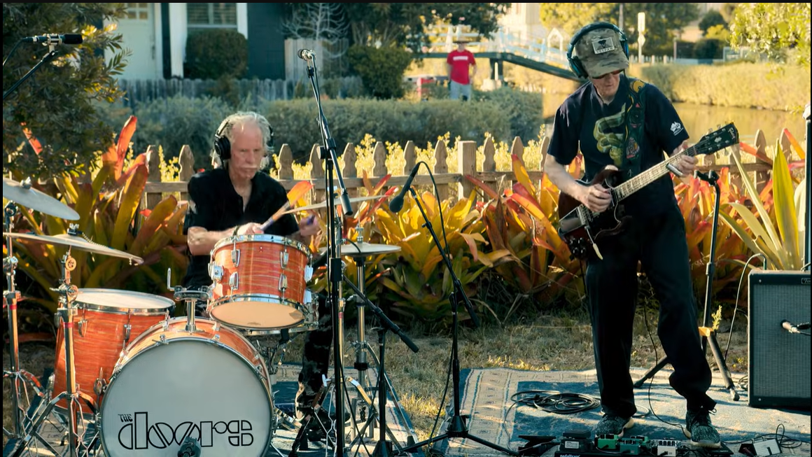 John Densmore (L, on drums) and Robby Krieger (R, on guitar) of The Doors performing in Playing For Change’s latest project, “Riders On The Storm”. (Image found online. Original source unknown.)