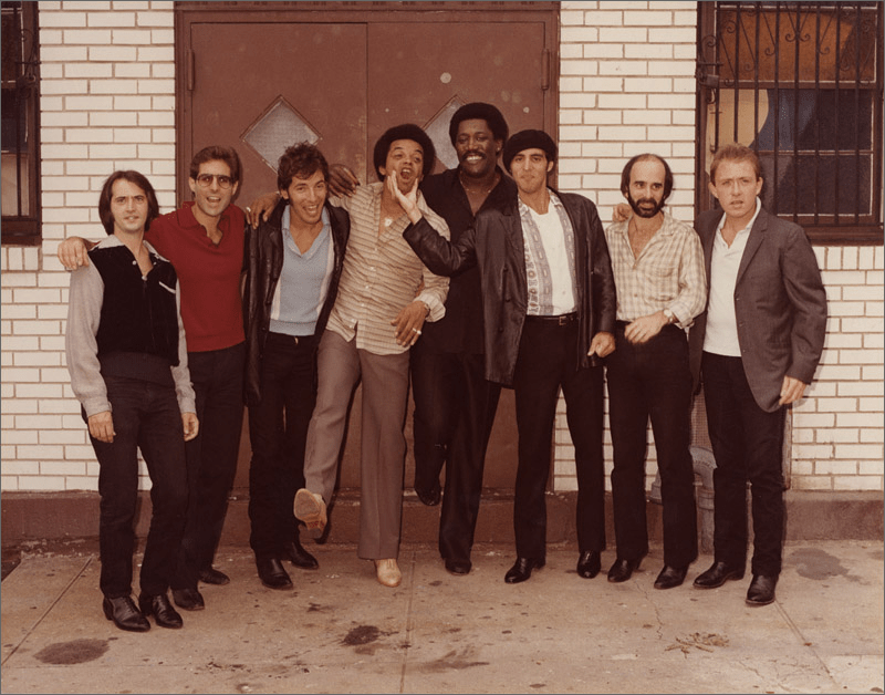 The E Street Band, Bruce Springsteen & Gary U.S. Bonds (L to R): Garry Tallent, Max Weinberg, Springsteen, Bonds, Clarence Clemons, Miami Steve Van Zandt, Roy Bittan and Danny Federici circa 1981. (Image found online.  Original source unknown.)