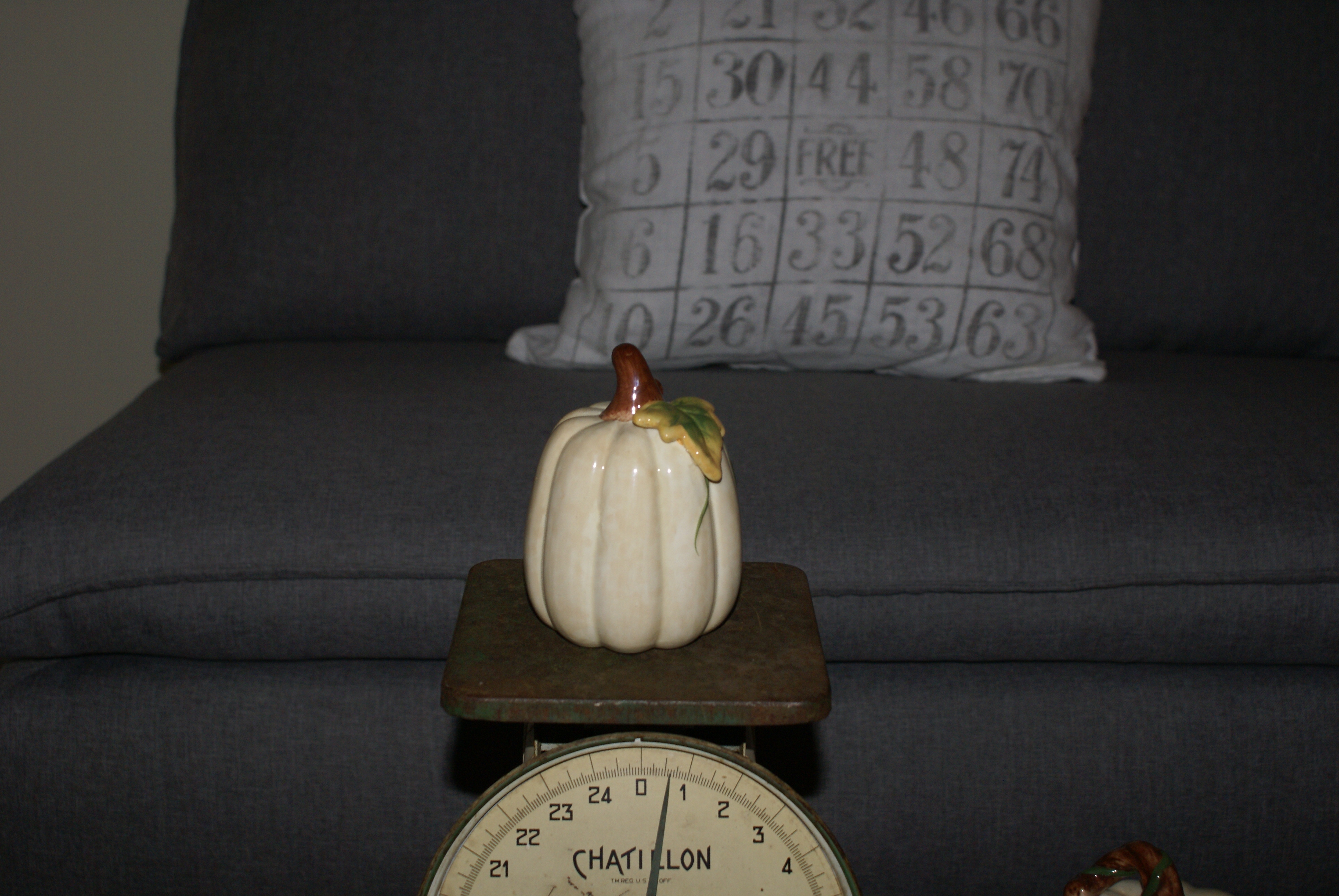 Where I am stuck is in my decorating. I usually have a very natural approach this time of year thanks to the bounty of nature. But the leaves have not started changing yet due to the warm climate, and the white pumpkins and gourds are in rare supply for now. I try not to buy too many fake ones because one, I prefer the real ones and two, I would rather not store any more items than I have to. But I do have a few ceramic ones.