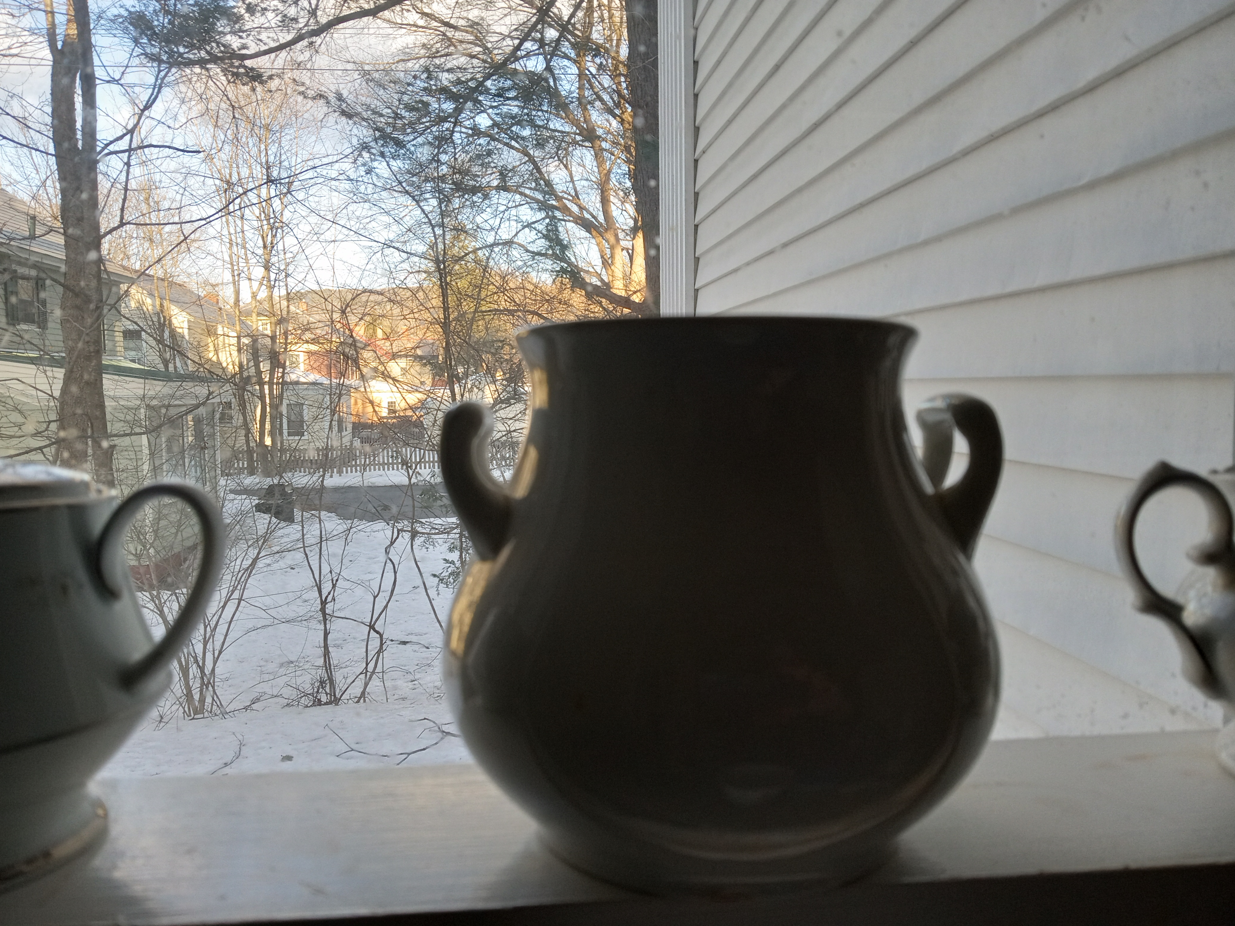 I have a few Ironstone sugar bowls that I keep with my other Ironstone pieces. But this weekend I found one of them without a lid and decided to bring it home. I have another un-lidded one that I use in my bathroom to hold my make up brushes, but this new to me one completed the bottom shelf of my kitchen display perfectly. And I really like how it looks next to the blue & white Winterling sugar bowl I spotlighted here back in January.